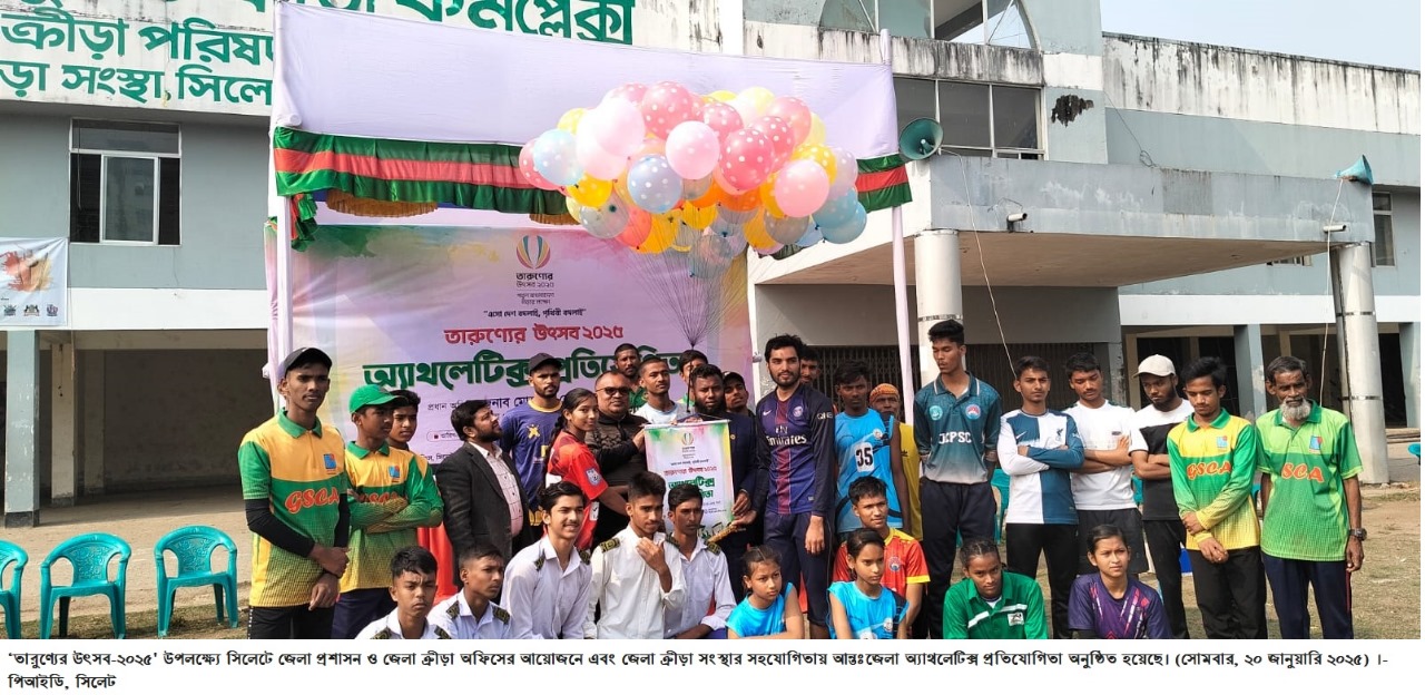 আজ সোমবার তারুণ্যের উৎসব-২০২৫' উপলক্ষ্যে সিলেটে জেলা প্রশাসন ও জেলা ক্রীড়া অফিসের আয়োজনে এবং জেলা ক্রীড়া সংস্থার সহযোগিতায় আন্তঃজেলা অ্যাথলেটিক্স প্রতিযোগিতা অনুষ্ঠিত হয়েছে। জেলা ক্রীড়া অফিসার ও সিলেট জেলা ক্রীড়া সংস্থার অ্যাডহক কমিটির সদস্য-সচিব মো. নূর হোসেনের নেতৃত্বে আজ সোমবার ২০ জানুয়ারি আবুল মাল আবদুল মুহিত ক্রীড়া কমপ্লেক্স মাঠে অনুষ্ঠিত হয়।