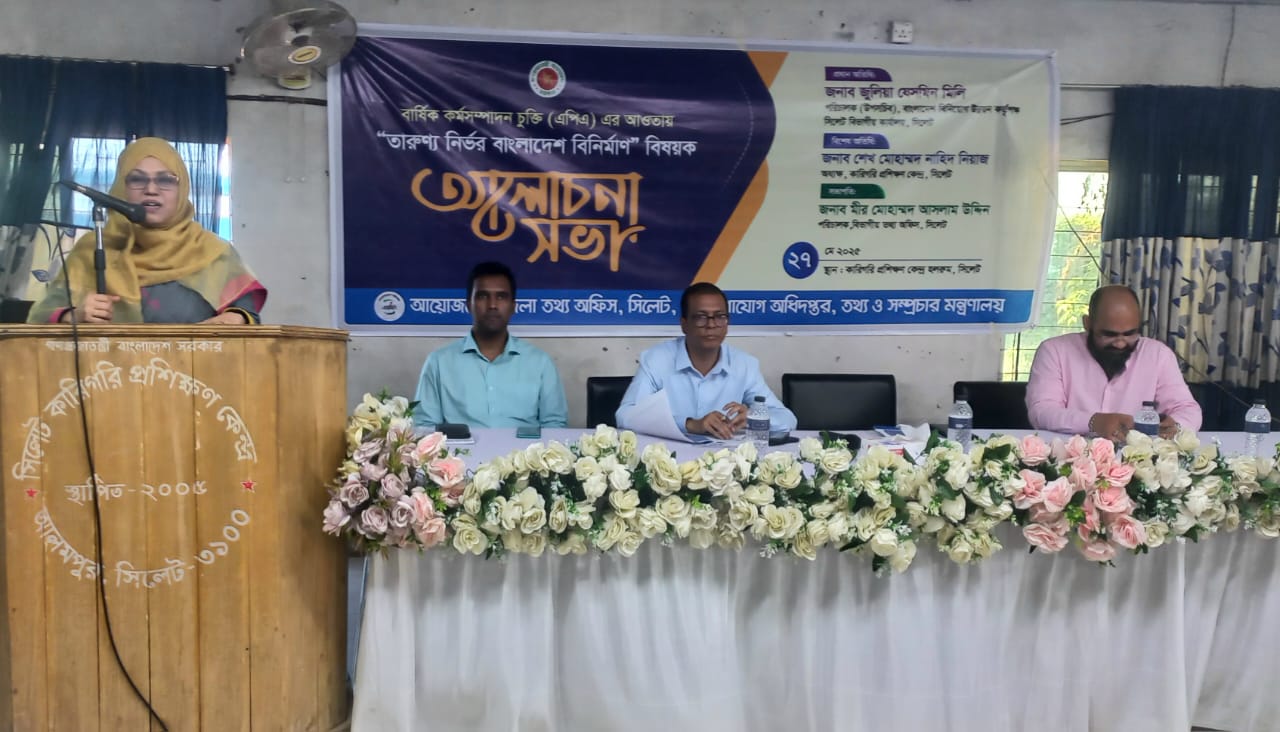২৭ মে মঙ্গলবার সিলেট জেলা তথ্য অফিসের উদ্যোগে সিলেট কারিগরি প্রশিক্ষণ কেন্দ্রের হলরুমে তারুণ্য নির্ভর বাংলাদেশ বিনির্মাণ শীর্ষক আলোচনা সভা অনুষ্ঠিত হয়েছে। অনুষ্ঠানে প্রধান অতিথি হিসেবে উপস্থিত ছিলেন বাংলাদেশ বিনিয়োগ উন্নয়ন কর্তৃপক্ষের সিলেট বিভাগীয় কার্যালয়ের পরিচালক জুলিয়া যেসমিন মিলি।