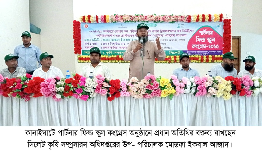 কানাইঘাটে আধুনিক, বিষমুক্ত ও জলবায়ু সহনশীল কৃষি উন্নয়নে “পার্টনার ফিল্ড স্কুল কংগ্রেস” অনুষ্ঠিত হয়েছে। গতকাল বুধবার দুপুরে উপজেলা কৃষি সম্প্রসারণ অধিদপ্তরের আয়োজনে উপজেলা পরিষদ মিলনায়তনে এই কংগ্রেসের আয়োজন করা হয়। কৃষি সম্প্রসারণ অধিদপ্তরের বাস্তবায়নে এবং ট্রান্সফরমেশন ফর নিউট্রিশন এন্টারপ্রেনরশিপ অ্যান্ড রেসিলিয়েন্স ইন বাংলাদেশ' প্রকল্পের আওতায় আয়োজিত এই কংগ্রেসে আধুনিক কৃষি ব্যবস্থাপনা, জলবায়ু সহনশীল কৃষি ও বিষমুক্ত খাদ্য উৎপাদনের রূপরেখা নিয়ে বিশদ আলোচনা হয়।